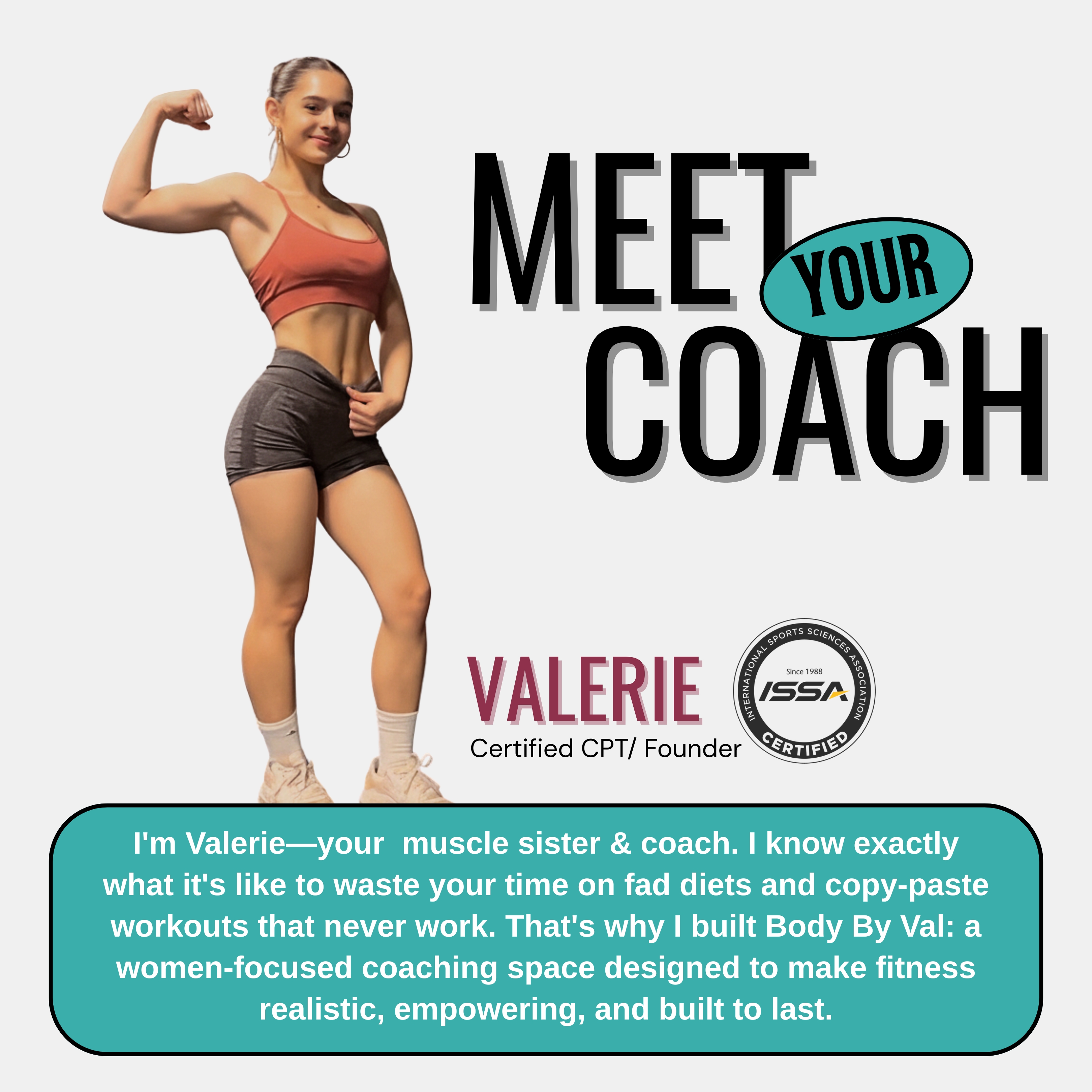 I'm Valerie - your friendly muscle sister & coach. I know exactly what it's like to waste your time on fad diets and copy-paste workouts that never work. That's why I built Body By Val: a women-focused coaching space designed to make fitness realistic, empowering, and built to last.